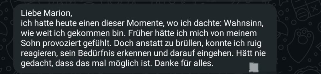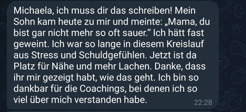 In unserem kostenlosen Telegram-Kanal „Goldene Familienmomente“ bekommst du die Impulsreihe Triggerfrei in 7 Tagen: 7 kurze Audios, 7 einfache Schritte, die sofort spürbar Entlastung bringen.